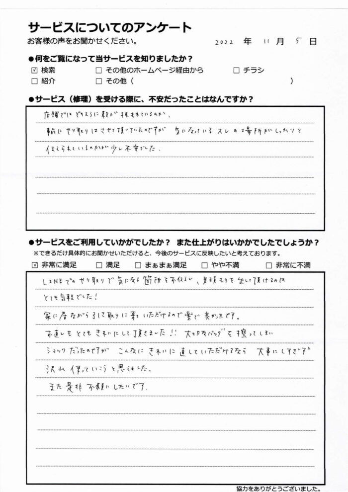 お直しもとてもキレイにして頂きました‼ 大切なバッグを擦ってしまいショックだったのですが、こんなにキレイに直していただけるなら、大事にしすぎず沢山使っていこうと思いました。