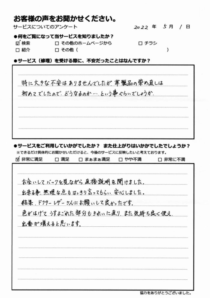 特に大きな不安はありませんでしたが、革製品の染め直しは初めてでしたので、どうなるのか・・・・という事ぐらいでしょうか。