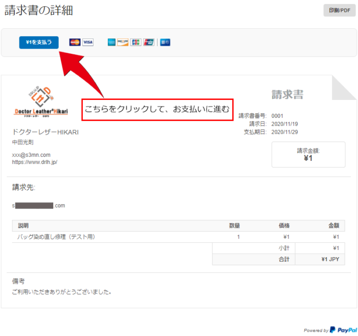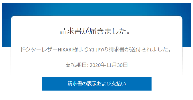 支払いが完了すると、ペイパルから「ドクターレザーHIKARI様に対して請求書の支払いを行いました」メールが確認のメールとして届きます。