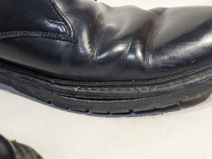 口が開いている状態なので、靴底を全部、取っちゃって、素材のところを綺麗にして、一から縫い直して、また新しい靴底を取り付けての修理になります。